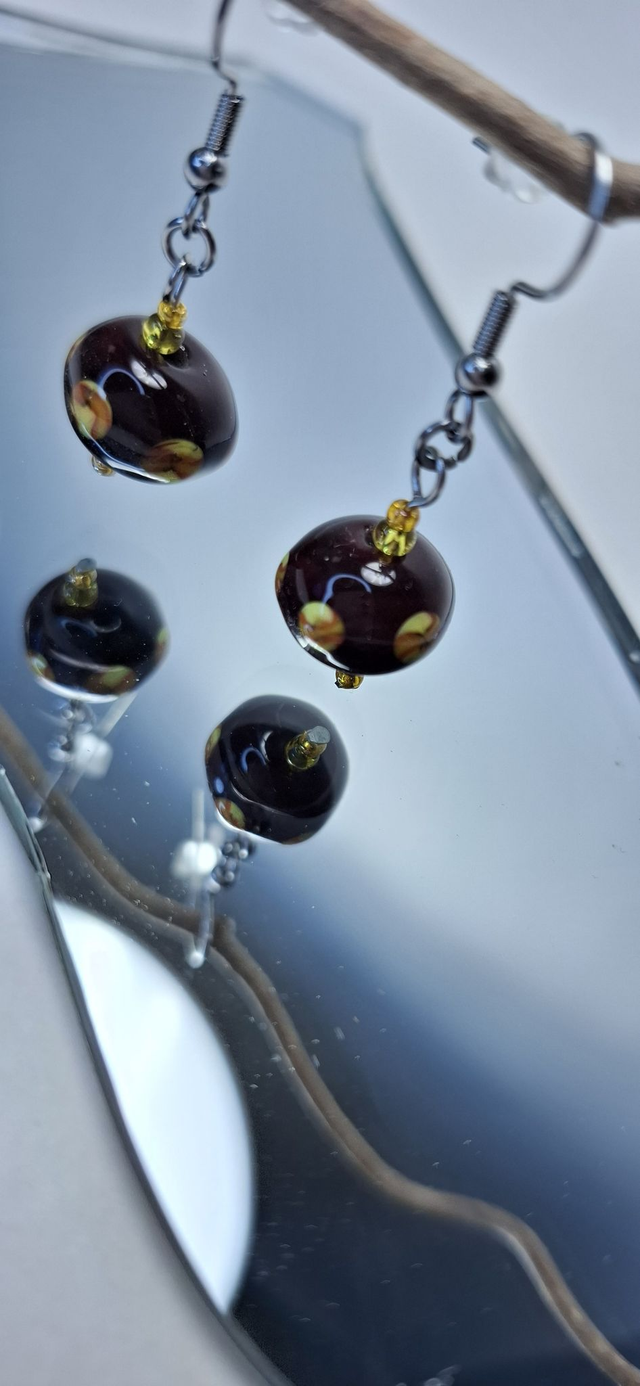 Lampputekniikalla käsin valmistetut lasihelmet, värinä maksa ja keltainen. Korvakorukoukut kirurginterästä, tutkittu ja turvallinen materiaali.