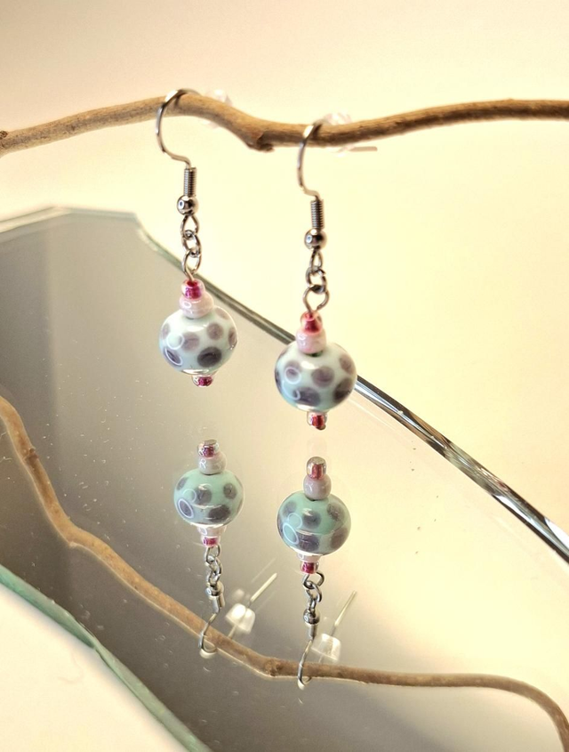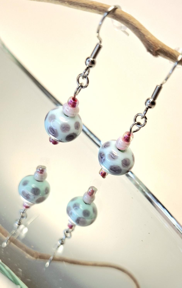 Käsin valmistettu vaaleansininen lasihelmi vaaleanpunaisilla pistesomisteilla. Lisäksi pinkit siemenhelmet. Korukoukku on kirurginterästä, tutkittu ja turvallinen materiaali.