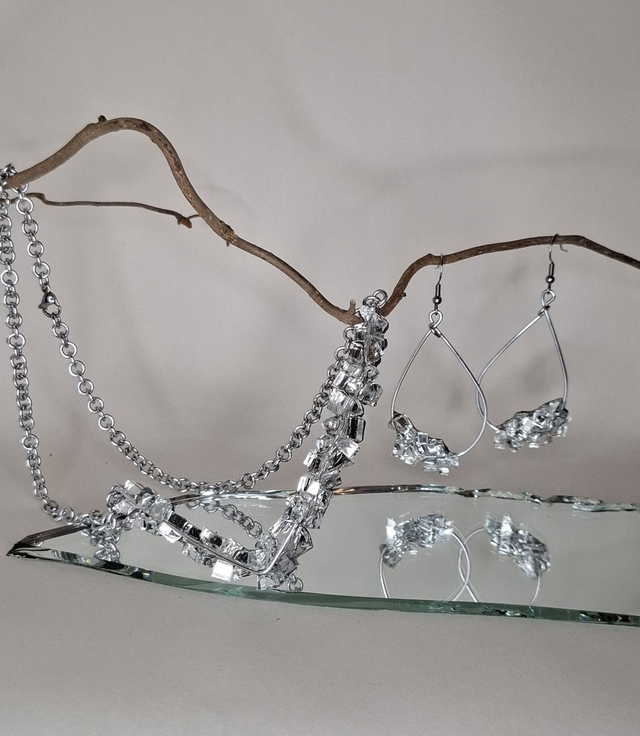Käsin tehty alumiiniketju, peilisirpaleet, UV-hartsi, korulukko kirurginterästä.