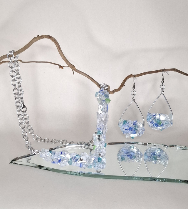 Pitelemätön - Veden vahva -korvakoruissa alumiinirunko, peilin- ja lasinsirpaleet, UV-hartsi. Korvakorukoukku kirurginterästä.