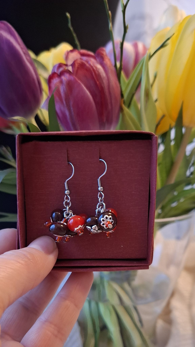 Kauniit punaiset käsin valmistetut lasihelmet rykelmänä korvakorukoukussa. Korvakorukoukku kirurginterästä.
