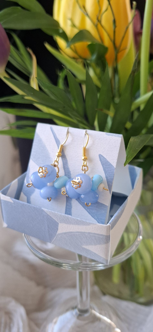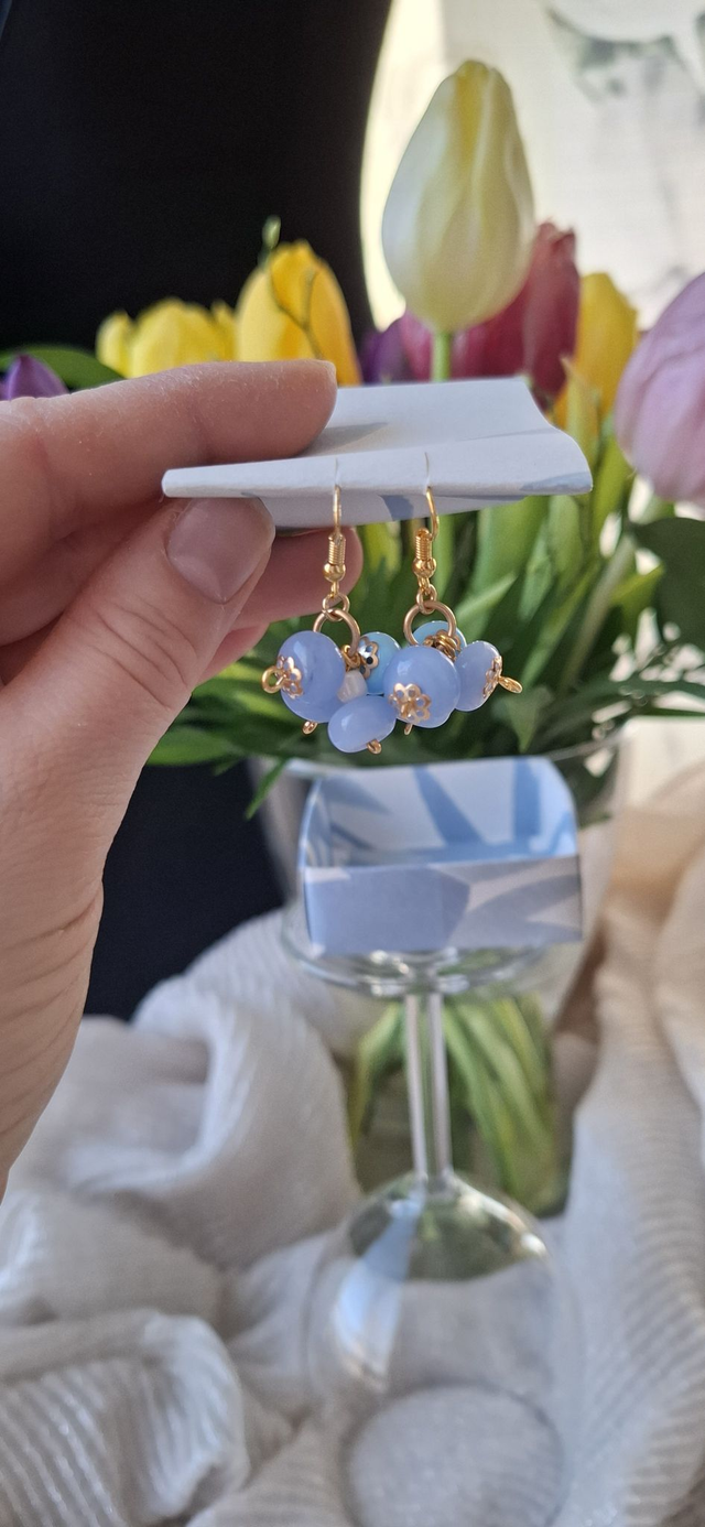 Rykelmä- korvakorut hempeillä babyblue-lasihelmillä ja kultaisilla koukuilla. Korvakorukoukut kullattua kirurginterästä.
