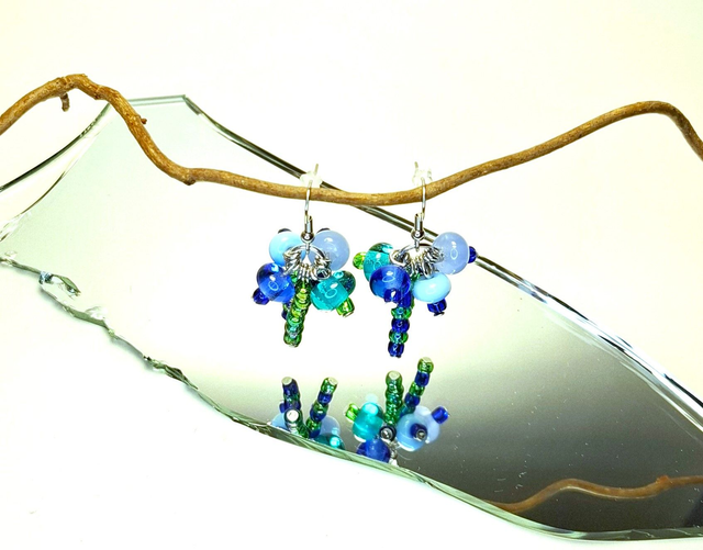 Upeita herkkiä sinisen vaaleita ja läpinäkyviä sävyjä rykelmänä, sekä pieniä siemenhelmiä pötkössä. Herkkää hehkua ja kaunista säihkettä. Korut kasattu laadukkaista materiaaleista, korukoukku on kirurginterästä - tutkittu ja turvallinen.